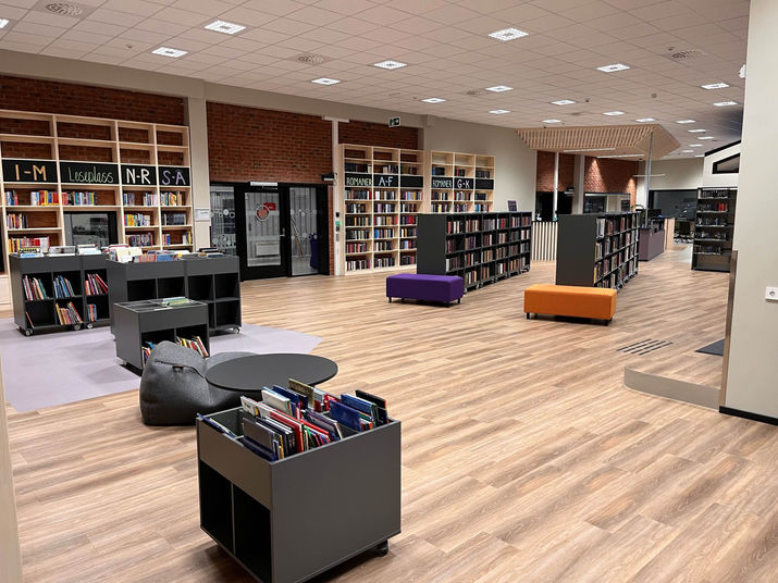 Tilbygg med nytt bibliotek og utvidelse av hovedinngang, delvis inne i eksisterende bebyggelse.